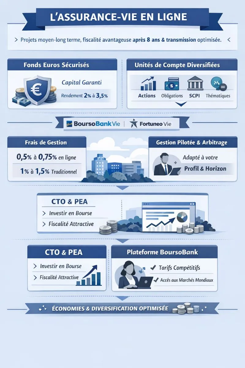 - Assurance-vie : BoursoBank Vie propose une large gamme de supports avec des frais de gestion réduits.